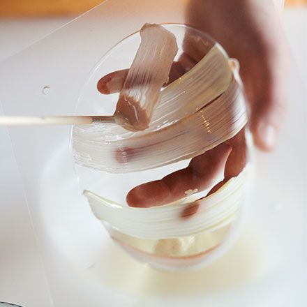 Calentar una bandeja para hornear en el horno hasta que se caliente. Póngase los guantes (evita las huellas dactilares) y tome una de las mitades del huevo. Cualquier borde desordenado puede fundirse plano manteniéndolos contra la bandeja. A continuación, frote con cuidado el borde plano del huevo en la bandeja para que se derrita un poco.