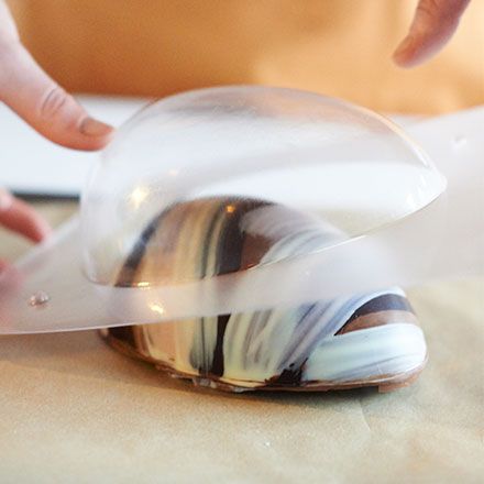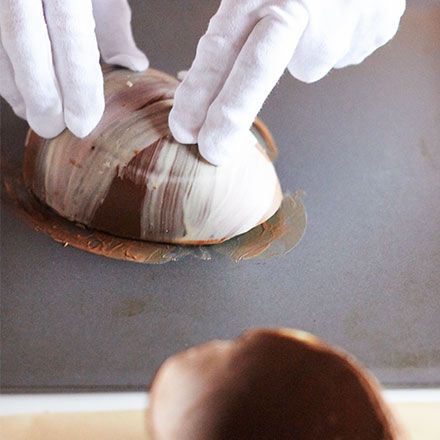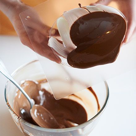 Derretir y templar el chocolate con leche. Rellene un molde con el chocolate hasta la mitad, luego inclínelo de esta manera para cubrir completamente el molde.