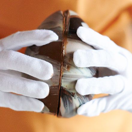 Mantenga los bordes derretidos del huevo juntos por unos momentos hasta que se peguen. Limpie cualquier exceso, luego deje que el huevo se asiente en la nevera durante unos minutos. El huevo ya está listo para regalar o envolver para la Pascua.