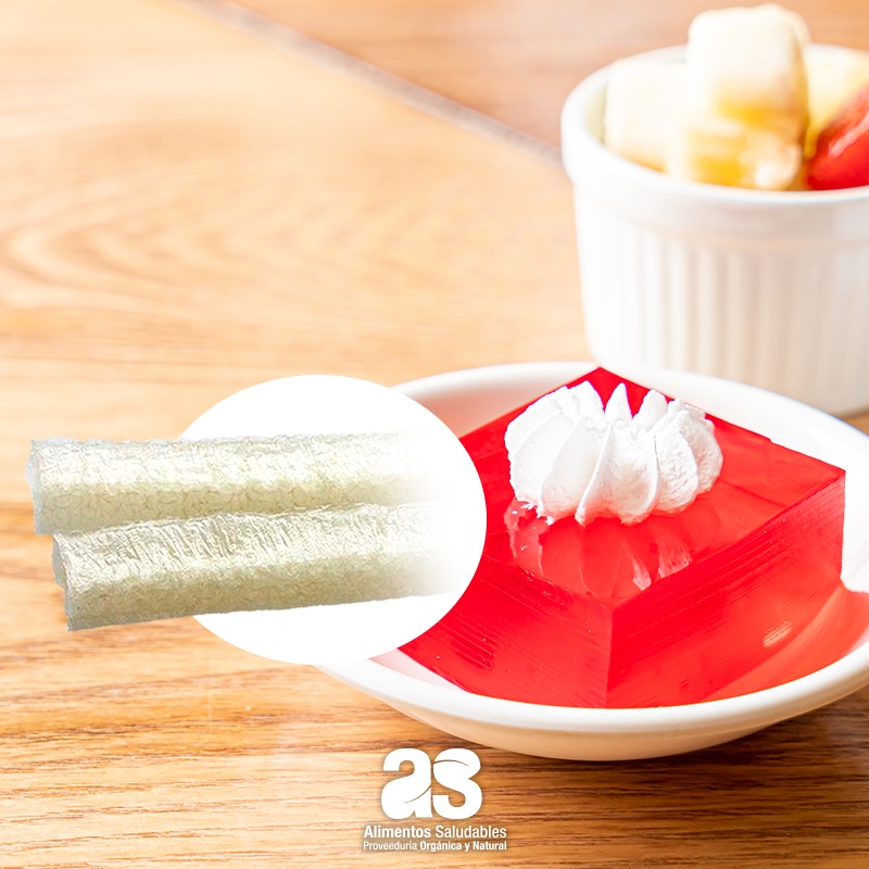 El Agar Agar es un gelificante natural que procede de algas rojas. Es ideal para hacer gelatinas que deban soportar altas temperaturas, lo ideal es usar 5 gramos por litro para obtener una gelatina estable.