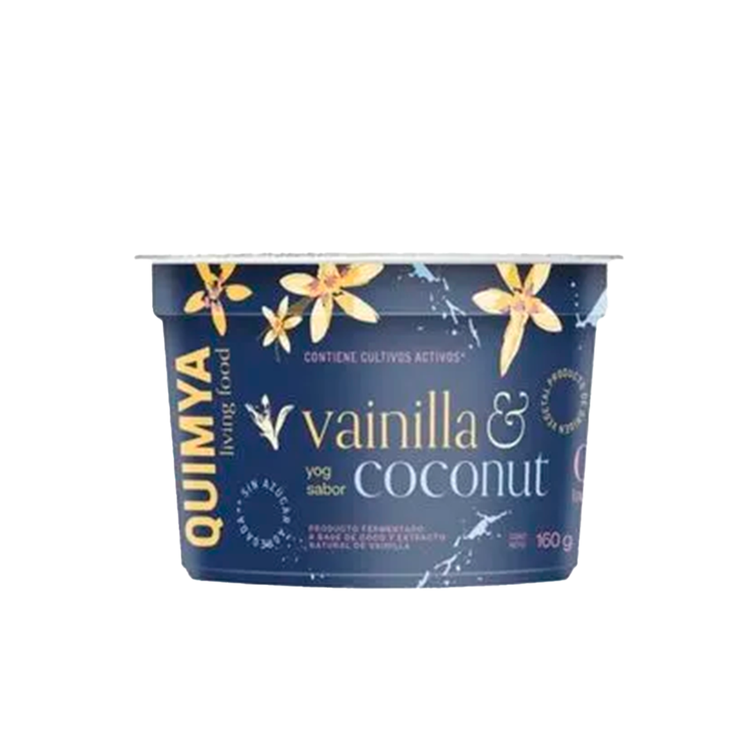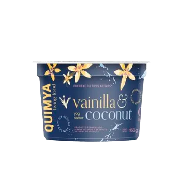 Producto cultivado a base de coco (Agua, base de coco, gelificante (agar agar), *cultivos activos (streptococcus thermophilus y lactobacillus delbrueckii ssp. bulgaricus. Adicionado con: lactobacillus acidophilus y bifidobacterium spp. lactis.)), estabilizante (goma xántica), sabor vainilla natural, sucralosa. PUEDE CONTENER ALMENDRAS, NUECES Y CASTAÑAS DE CAJÚ.