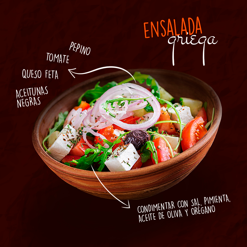 Una ensalada griega es un giro en una ensalada verde tradicional. Es baja en calorías y rica en nutrientes, también le proporciona una dosis saludable de vitaminas A y C, así como de potasio y hierro. Además, contiene fitonutrientes y antioxidantes, lo que reduce el riesgo de problemas de salud como enfermedades cardíacas y cáncer.