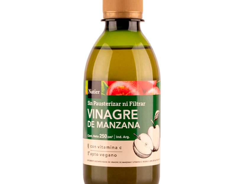El vinagre de manzana se puede considerar un superalimento con múltiples cualidades. Es producto de la fermentación acética de la mezcla de azúcar y agua. Primero las levaduras transforman los azúcares en alcohol y luego las bacterias Mycoderma aceti o bacterias acéticas transforman el alcohol en ácido acético, lo que da lugar a su olor y sabor típicos. Contiene cantidades moderadas de pectina y abundante potasio. Sus oligoelementos y minerales fortalecen el sistema inmunitario, ayudan contra los dolores de cabeza y el asma, fortalecen la piel, el cabello, las uñas, y apoyan el tratamiento de la diabetes. Además, produce un efecto positivo sobre los niveles de colesterol y lípidos en sangre, protege contra la presión arterial alta y estimula la digestión. En menor cantidad, aporta vitaminas B1, B2 y B6, biotina, ácido fólico, niacina, ácido pantoténico, fósforo, calcio y magnesio.